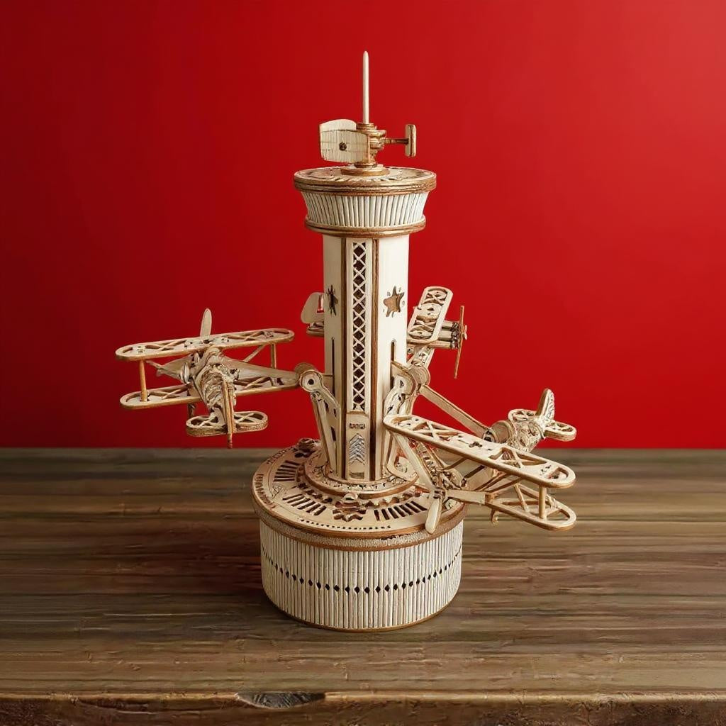 Der filigrane Flugzeug-Turm vereint nostalgische Flugzeuge mit einem sanften LED-Lichtspiel. Beim Aufziehen setzt sich die Mechanik in Bewegung und die kleinen Flugzeuge kreisen melodisch begleitet um den Turm. Ein faszinierendes Holzmodell für Bastelbegeisterte, das Technik und Poesie harmonisch verbindet – ideal als dekorative Miniaturwelt mit besonderem Charme.