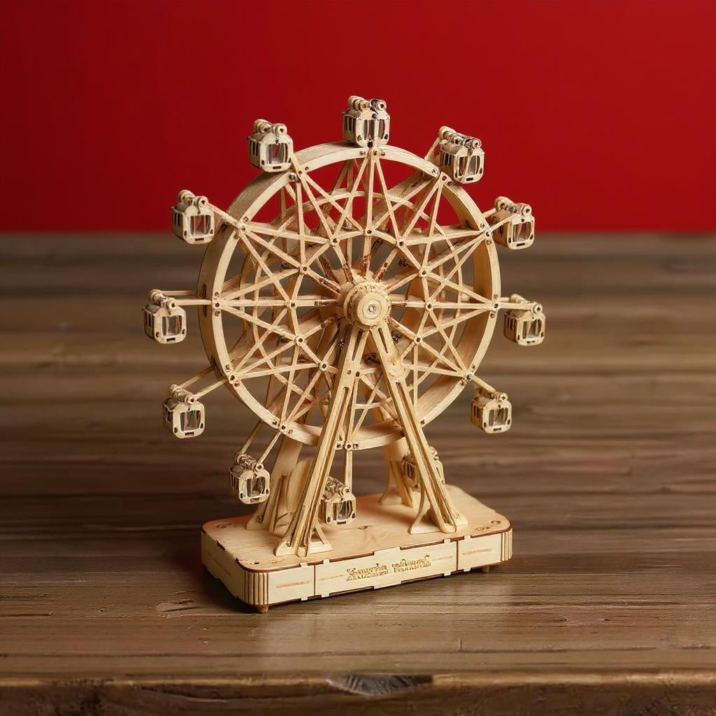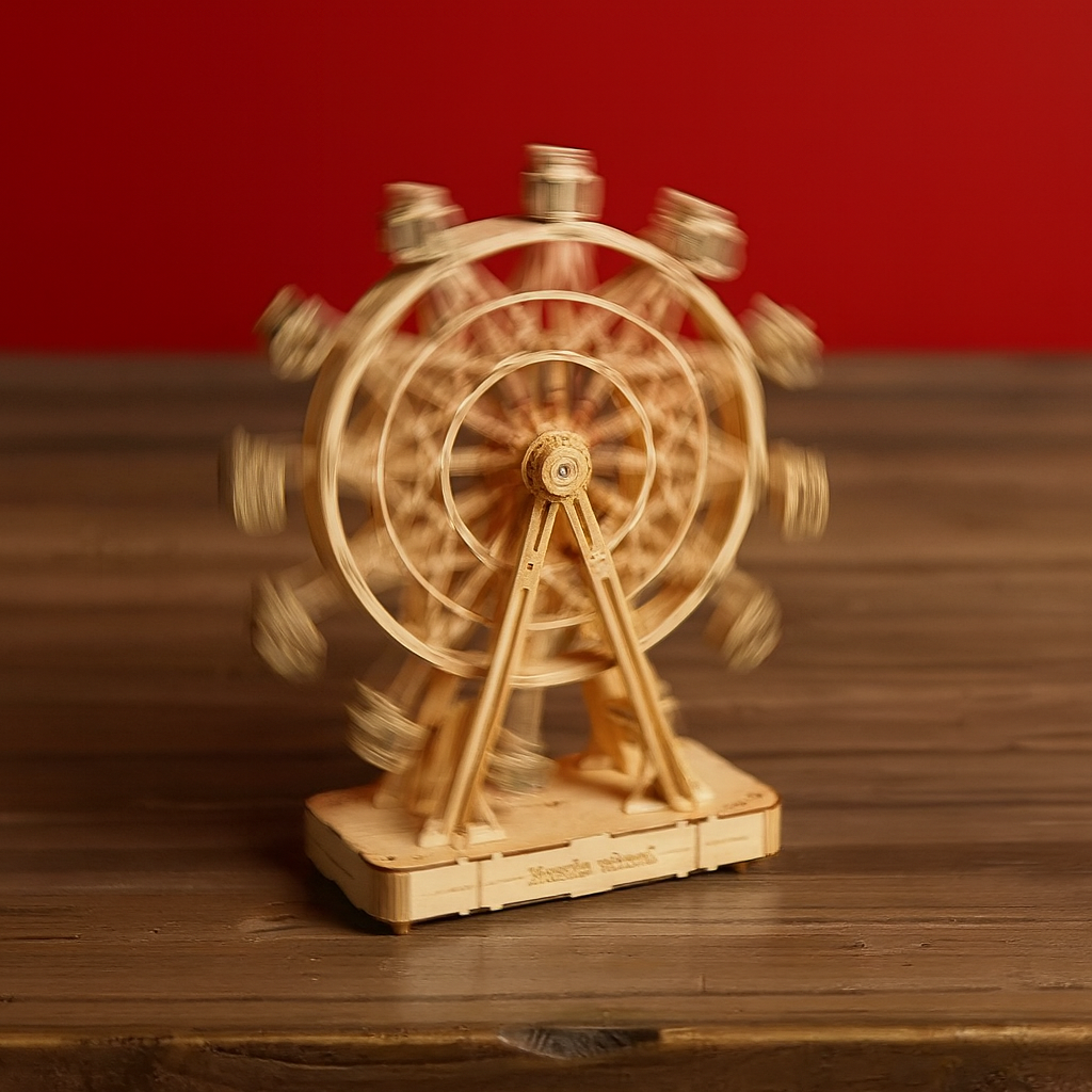 Das imposante Riesenrad verbindet eindrucksvolle Mechanik mit musikalischem Zauber. Beim Aufziehen beginnt sich das detailreiche Holzmodell zu drehen und spielt dabei eine harmonische Melodie. Ein echter Blickfang, der die Faszination klassischer Jahrmärkte einfängt – perfekt als Geschenk oder als dekoratives Stück für zuhause.