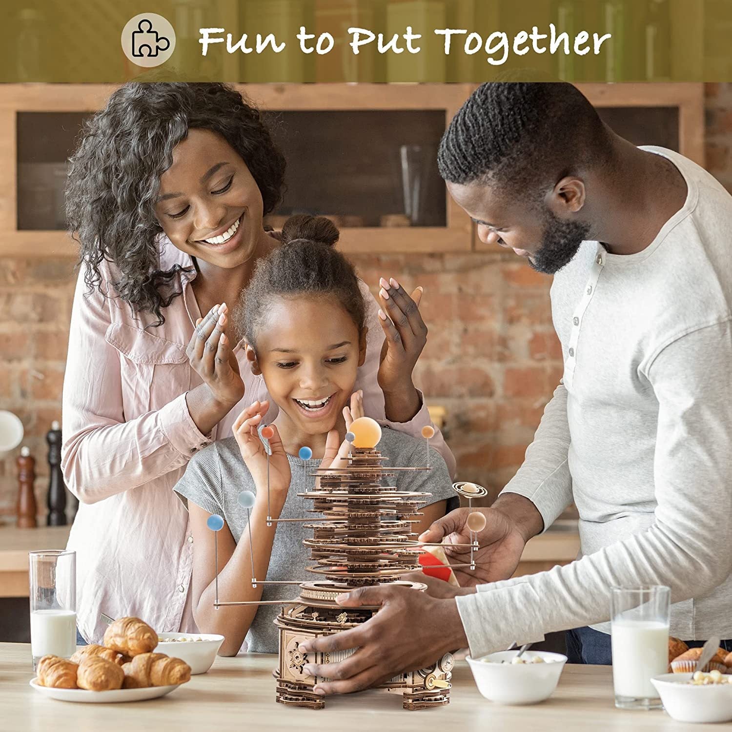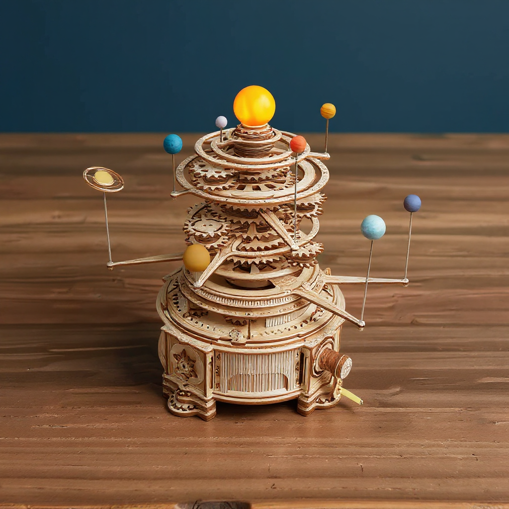 Erlebe die Magie des Universums mit diesem detaillierten mechanischen Modell unseres Sonnensystems. Das hochwertige 3D-Holzpuzzle besteht aus 316 lasergeschnittenen Teilen, die sich zu einem rotierenden Planetenmodell mit Zahnradmechanismus zusammensetzen. Beim Drehen der Kurbel bewegen sich die Planeten auf ihren Umlaufbahnen – ein faszinierendes Zusammenspiel von Technik und Ästhetik. Perfekt für Astronomie-Fans, Bastelbegeisterte und alle, die spielerisch lernen möchten. Ein dekoratives Meisterwerk und ein ideales Geschenk für kreative Köpfe.