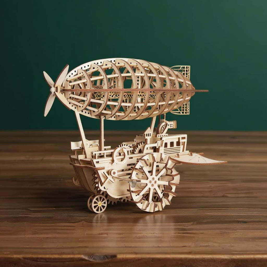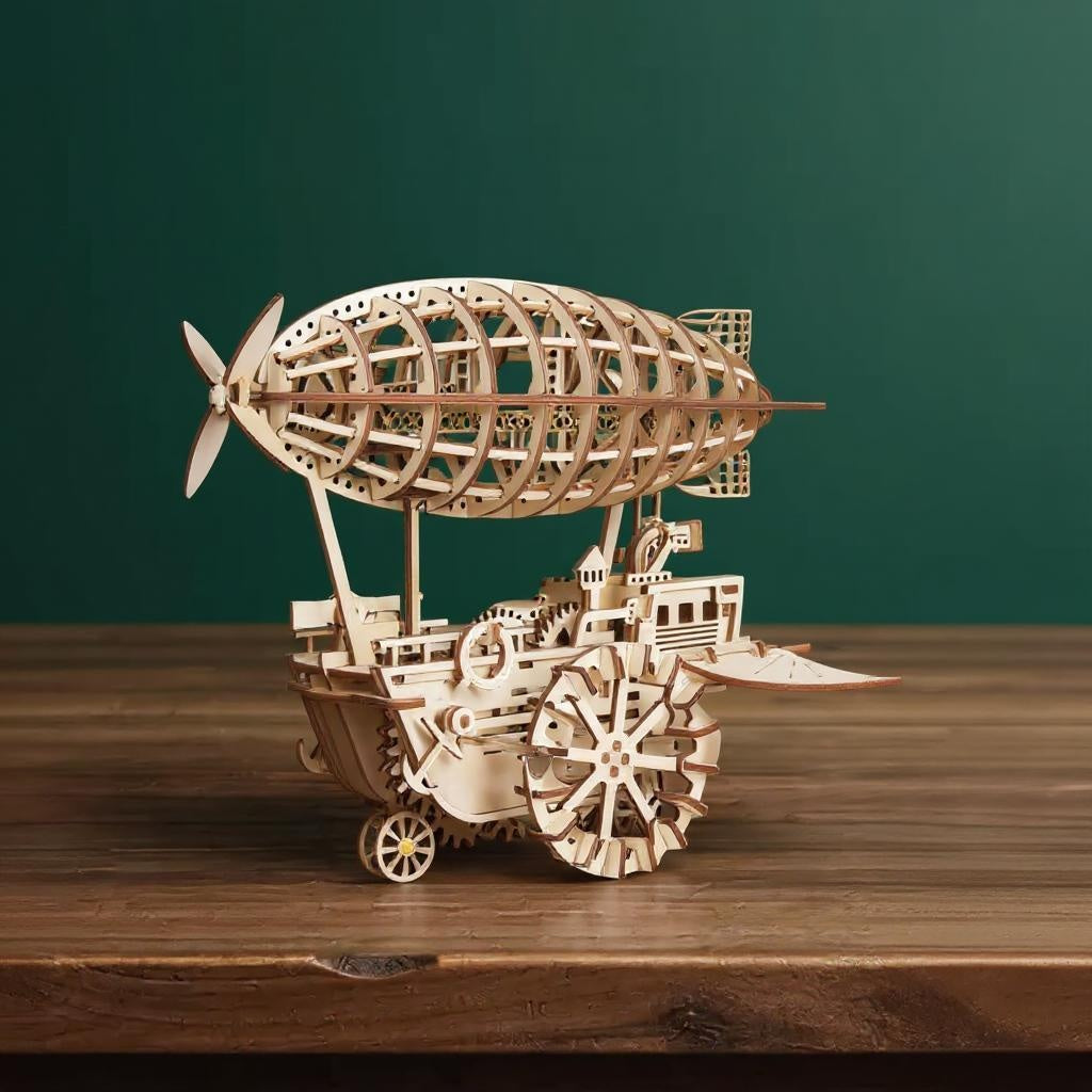 Das Modell „Luftschiff“ ist ein anspruchsvoller 3D-Bausatz aus Holz mit mechanischem Getriebe. Es kombiniert nostalgisches Design im Stil der industriellen Revolution mit modernster Laserschneidtechnik – ideal für Bastler, Technikfans und kreative Köpfe ab 14 Jahren.
